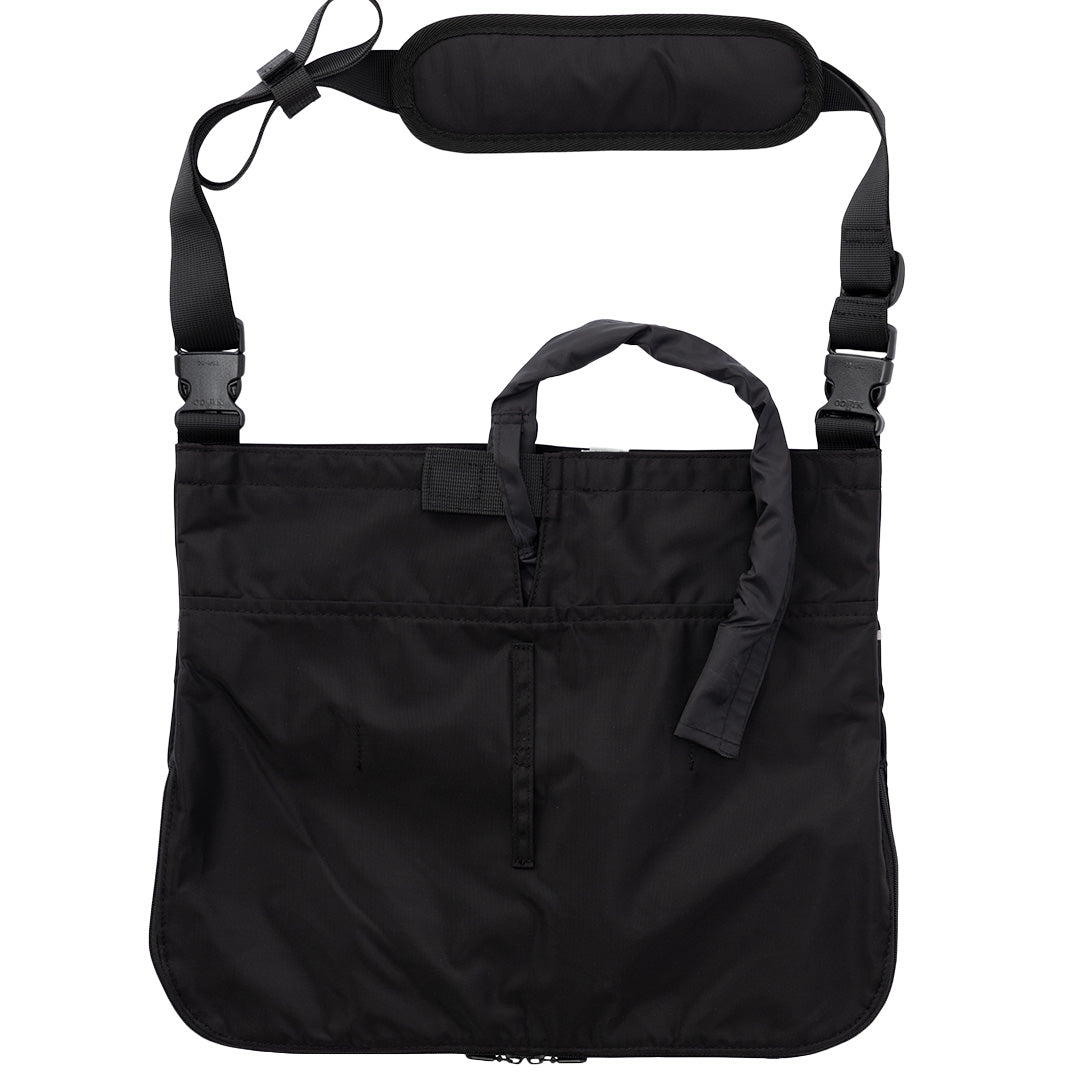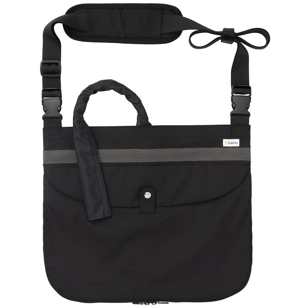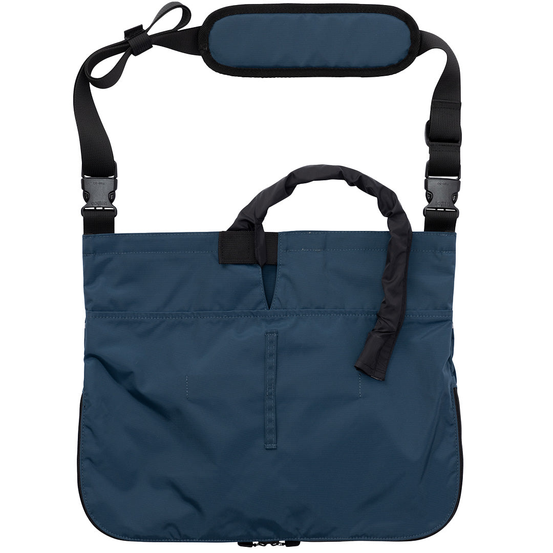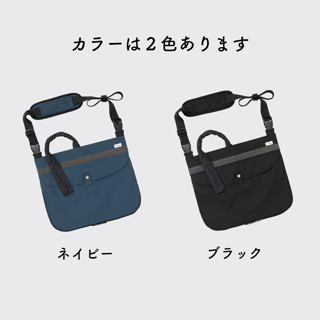 ベッド横にかけたり、肩掛けベルトを伸ばして持ち出してご利用いただけます。布地は撥水タイプとなります(チャック部分は除く)。